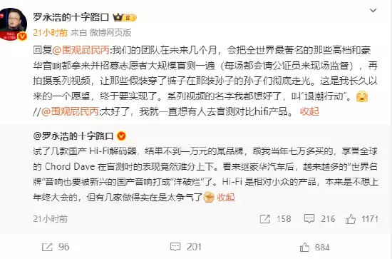 就在前一天,也就是12月1日,罗永浩再次通过微博透露了一个重磅计划:“接下来几个月,我们的团队会把全球那些最著名的高端和豪华音响品牌全都请来,组织一场大规模的志愿者盲测活动,而且每场都会邀请公证员现场监督。我们会把整个过程拍成系列视频,让那些明明穿着‘皇帝的新装’、却还在那里装模作样的品牌彻底曝光。”他进一步补充道:“这个想法在我心里酝酿很久了,现在终于要落地实现。连系列视频的名字我都想好了,就叫‘退潮行动’。”