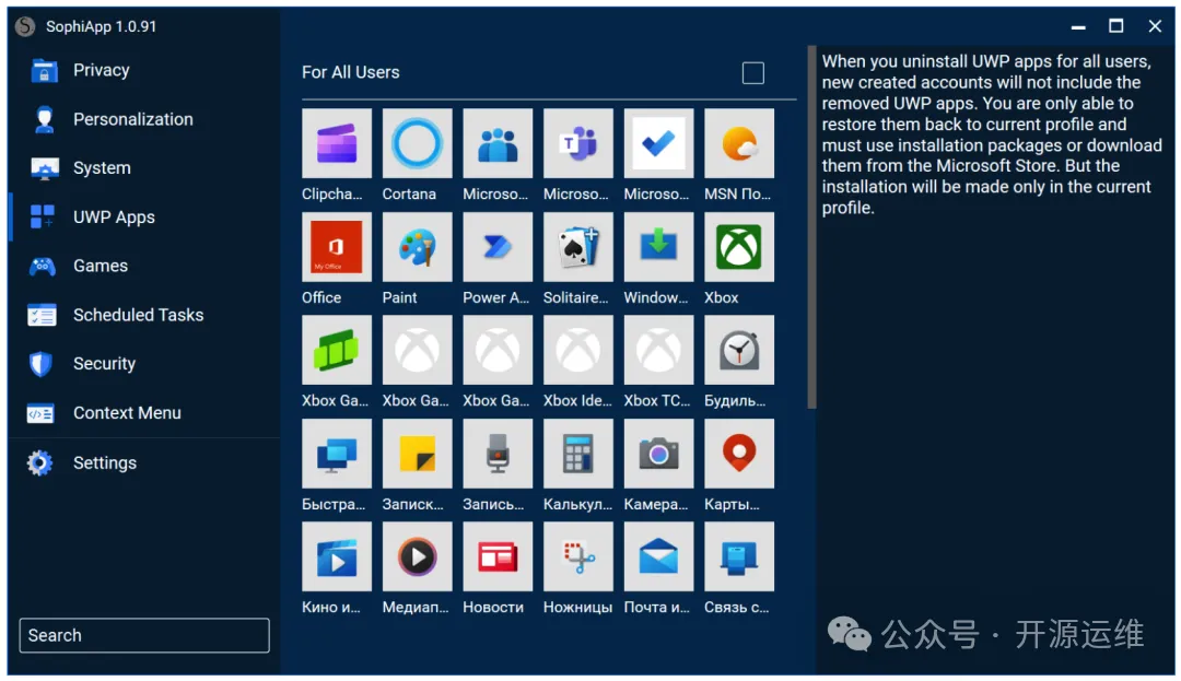 它提供了一个完整的 UWP 应用卸载列表,即那些从微软商店安装的现代应用程序。这个列表非常人性化,应用名称都经过本地化处理,还显示了应用图标,有效防止误删。更贴心的是,它还能“彻底”卸载 OneDrive,对于不想使用该功能的用户来说绝对是个福音。