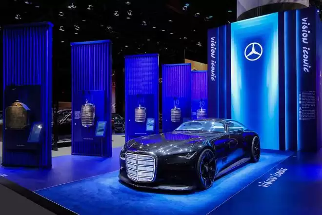 与之呼应的Vision Iconic概念车,则以重塑品牌美学的姿态演绎未来设计语言。全新盾形格栅融合经典竖向线条与数字化光影,搭配L4级自动驾驶技术与太阳能动力系统,昭示着奔驰在设计、效能与智能领域的协同突破。