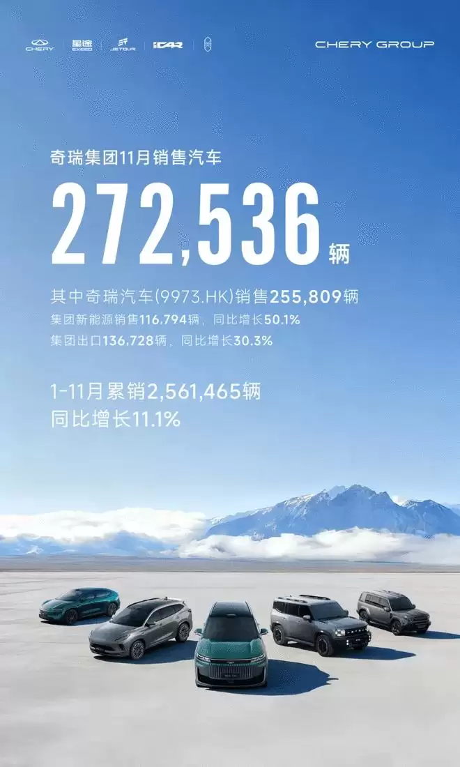 据网易汽车12月2日报道,奇瑞集团在11月交出了272,536辆的销售成绩。其中,新能源汽车单月销量达到116,794辆,实现50.1%的同比增长,连续第四次创下历史新高;出口业务表现同样亮眼,单月出口136,728辆,同比增长30.3%,连续七个月单月出口突破10万辆大关,继续稳居中国汽车出口榜首。奇瑞汽车股份有限公司(股票代码:9973.HK)11月整车销售255,809辆。