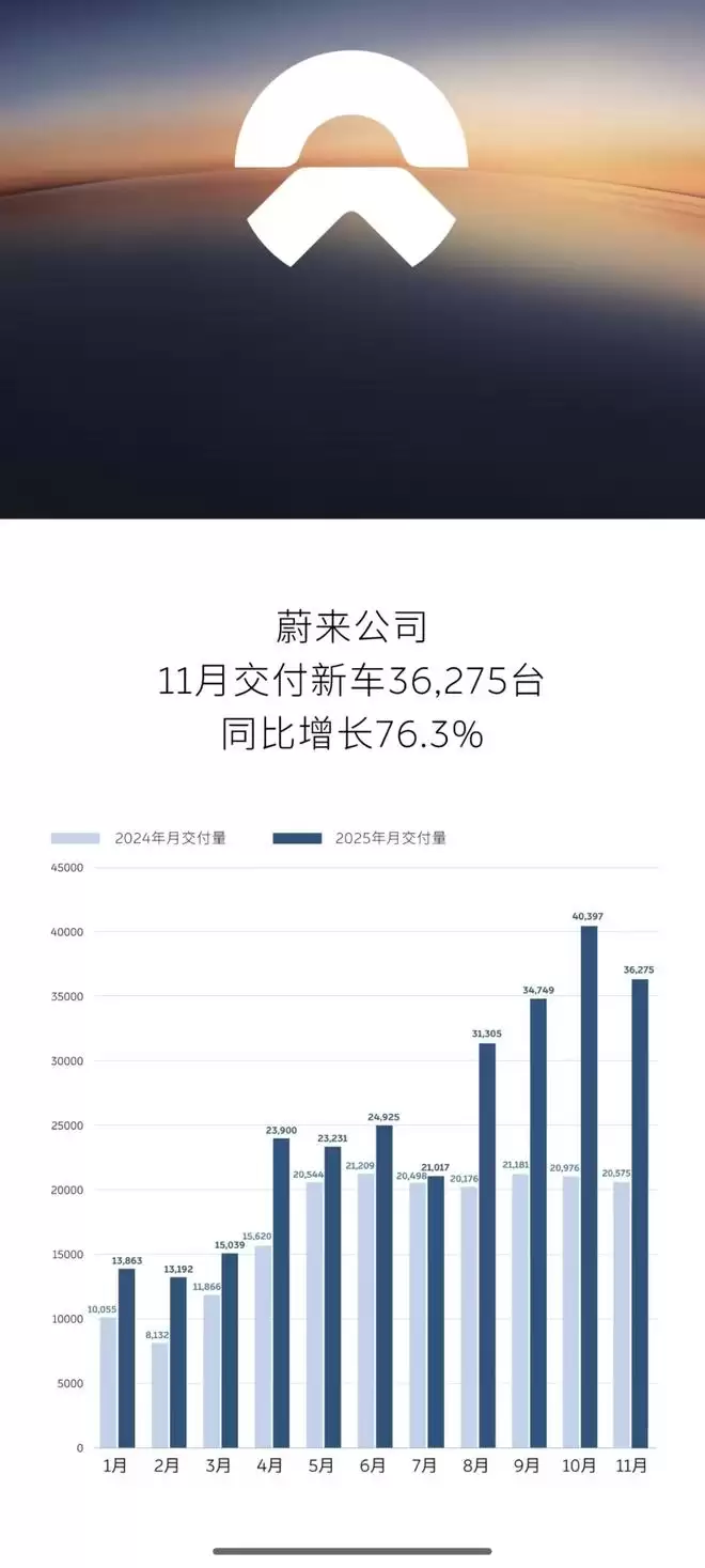 蔚来11月交付36,275台,同比大增76.3%创纪录