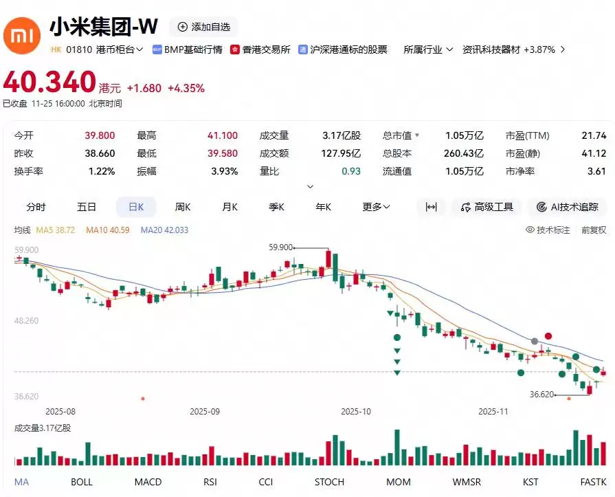 受此消息提振,小米集团股价在25日收盘时上涨4.35%,收于40.34港元。