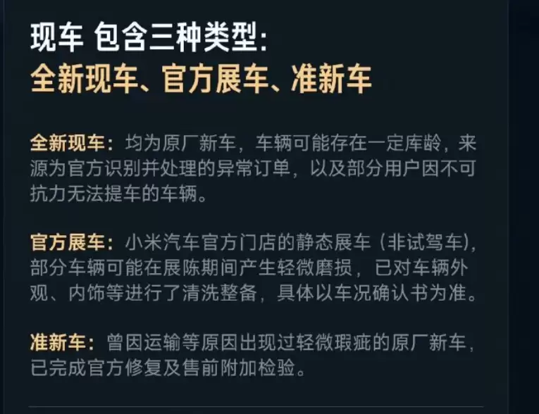 12月1日,小米汽车创始人雷军通过社交平台宣布,小米汽车APP将于近期上线现车选购功能。根据规则,用户在12月26日24点前完成锁单,可享受年底前提车服务。这一模式覆盖三类现车资源:全新现车、最新展车及准新车,所有车辆均通过严格质检流程,并提供完整原厂质保及售后支持,部分车型还推出优惠方案。
