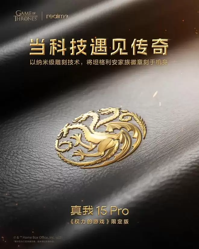 参考最新信息来看,这次具体的联名机型为真我15 Pro,其以纳米级鎏金雕刻技术,将坦格利安家族徽章刻于机身。
