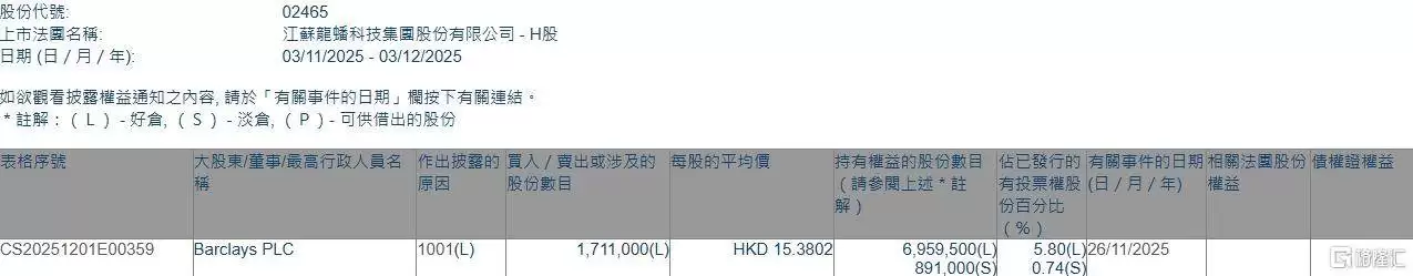 据联交所最新权益披露资料显示,2025年11月26日,龙蜛科技(02465.HK)获得Barclays PLC以每股均价15.3802港元增持好仓171.1万股,涉资约2631.55万港元。