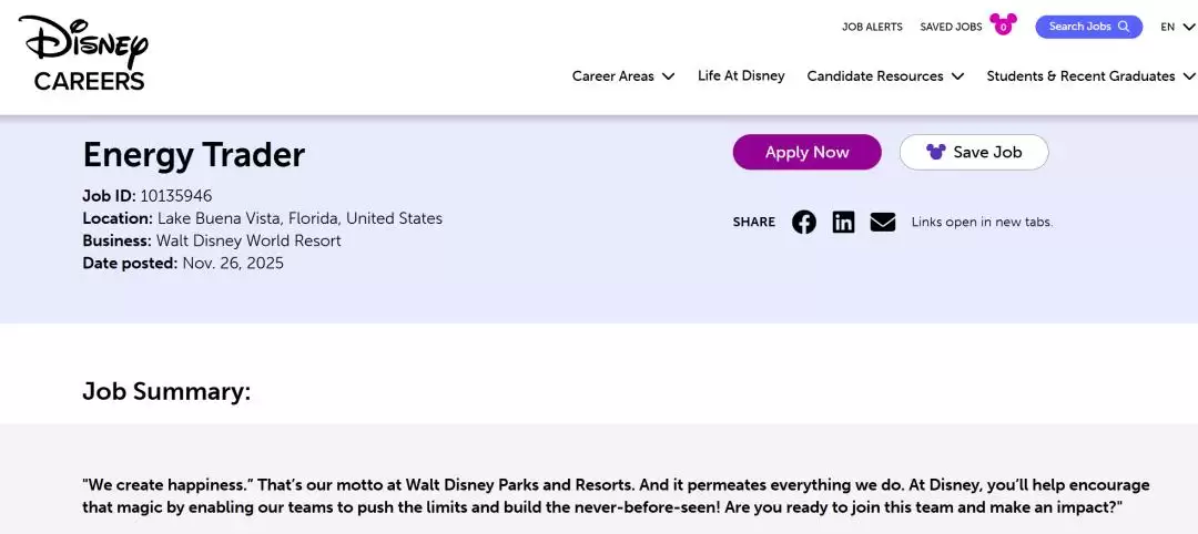 根据公司官方发布的招聘启事,迪士尼正在佛罗里达州奥兰多招募一名全职能源交易员。