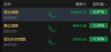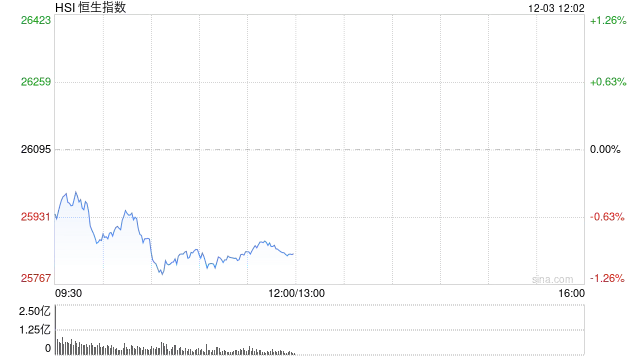 12月3日,香港股市三大指数低开低走。截至午间收盘,恒生指数下跌0.97%,报25842.77点;恒生科技指数下挫1.30%,国企指数跌幅为1.26%。盘面上,科技股普遍表现疲软,网易跌幅超过3%,哔哩哔哩下跌逾2%,阿里巴巴、快手、联想及腾讯均跌超1%。相比之下,有色金属板块表现活跃,中国铝业(601600)涨幅突破5%;汽车股走势偏弱,小鹏汽车跌幅超过3%;生物医药板块整体回调,药明合联跌逾3%。今日两只新股登陆市场,乐摩科技暴涨56%,金岩高岭新材料上涨超过1%。