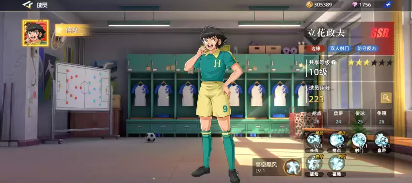 立花政夫在游戏中也是一名前锋,可以与边锋位置的球员互换使用。通常情况下,他与立花和夫往往作为搭档一同上场,因为他们两人正是“双人射门”组合的主要成员。在防守反击方面,他能带来不亚于立花和夫的效果,不过在总体评分上比立花和夫高出2分。从技能效果来看,他在使用技能时基础带来的长传效果要比立花和夫更为实用。若在未受抢球属性干扰的情况下,他所增加的15%长传属性还能带来更佳的传球效果。此外,在后期使用各类突破技能进行抢点的时候,他所具备的“高空飘风”能力可以让他在空中动作上占得先机,从而在抢点时更具优势。