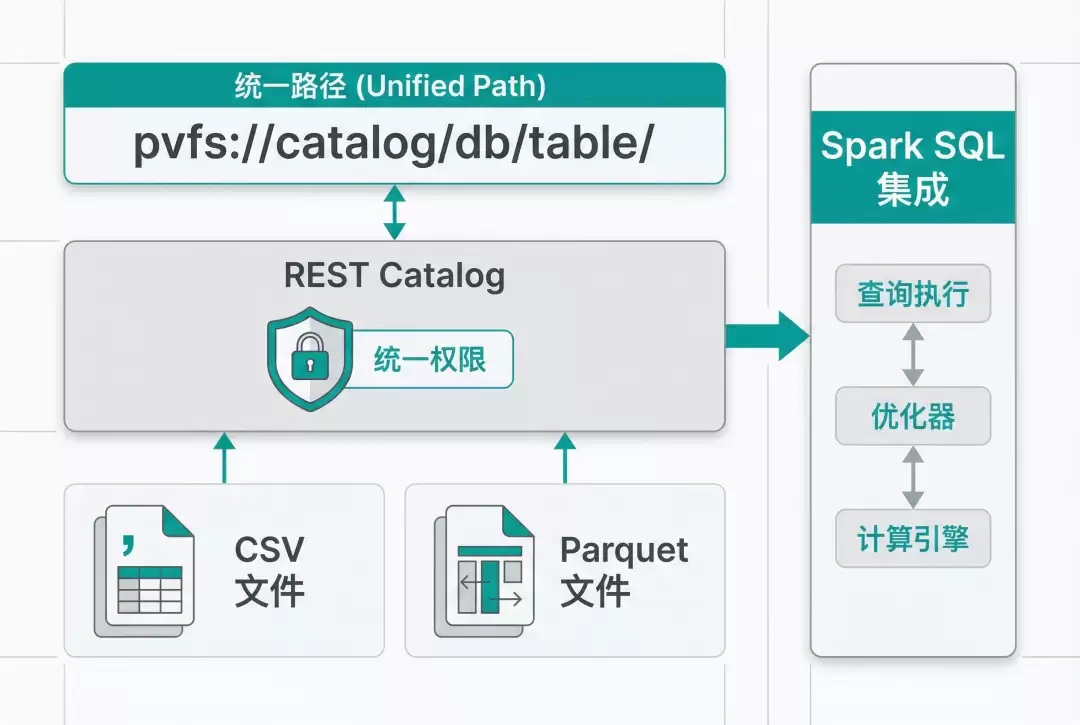 通过 pvfs://catalog/db/table/ 路径格式,用户可以直接访问 REST Catalog 管理下的底层文件(如 CSV、Parquet 等格式)。
