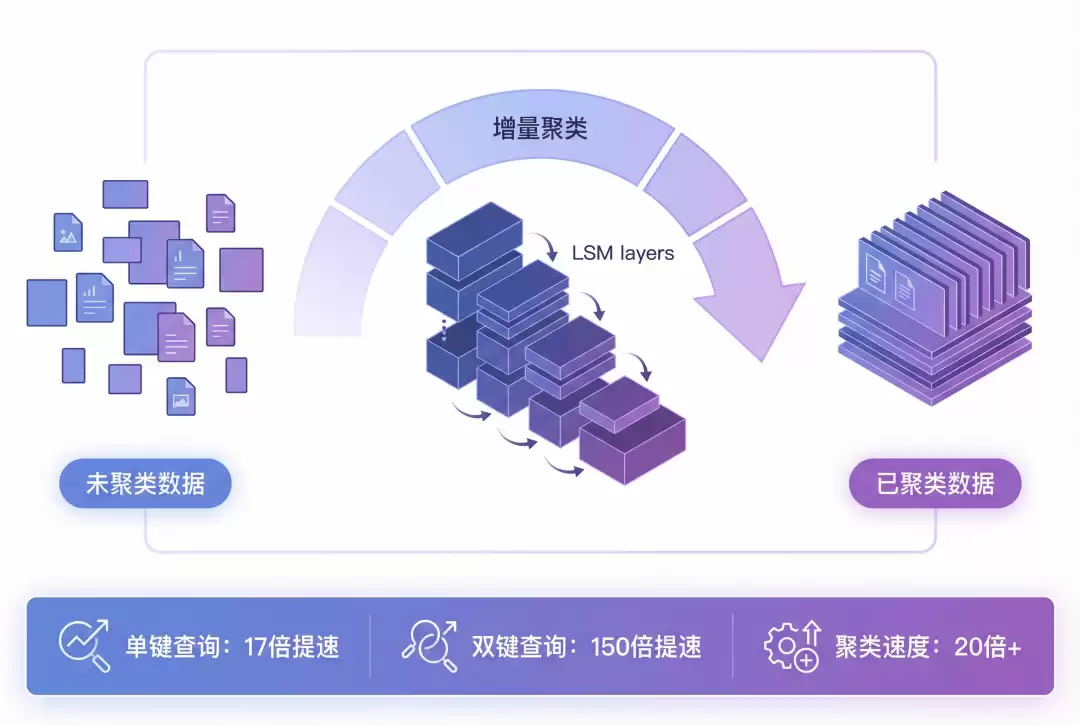 支持动态调整聚类键配置,无需全量重排;采用分层 LSM 结构有效控制写放大问题。