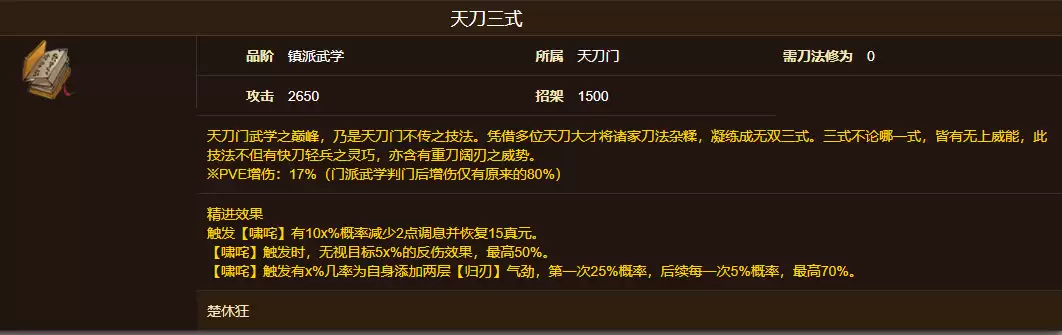 天刀三式:招式受秘技影响较大(如"无我重刃"、"无我快刃"),伤害波动明显。需要精确触发二段伤害,对玩家的时机把握要求较高,操作难度相对更大。
