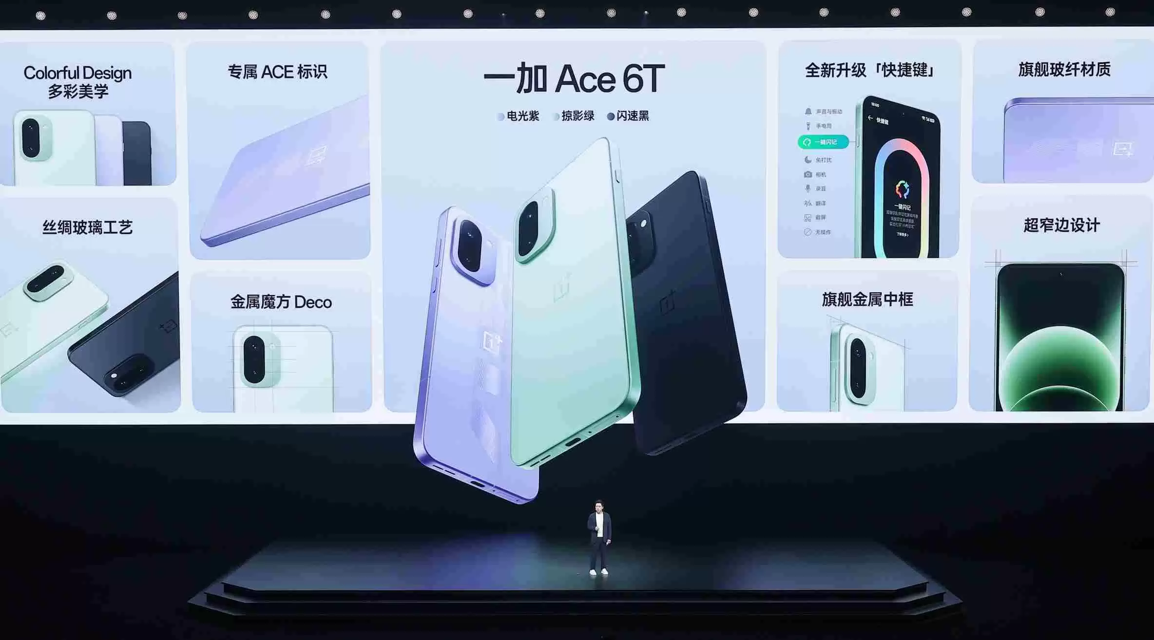 一加Ace 6T提供了掠影绿、电光紫、闪速黑三款配色,延续了简洁时尚的设计语言,通过Colorful Design多彩美学设计展现出全面的旗舰质感。机身搭配圆润的“黄金R角”与高强度微弧金属中框,正面采用超窄边框设计,并配备全新升级的快捷按键,新增九大实用功能。