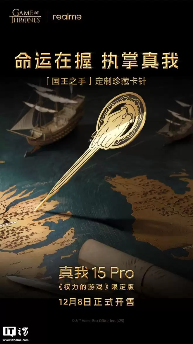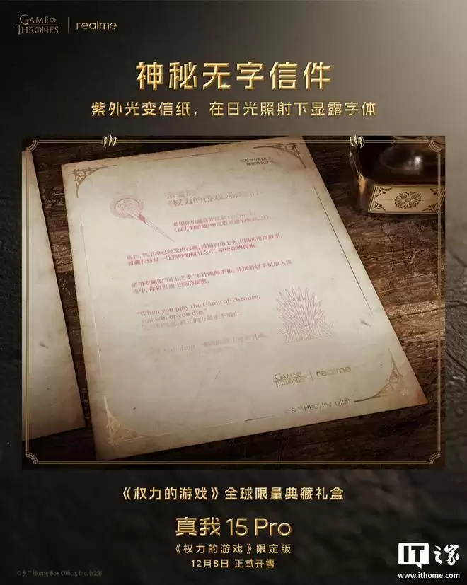 据IT之家昨日报道,真我15 Pro《权力的游戏》限定版手机将于12月8日上午10点开启限量发售。
