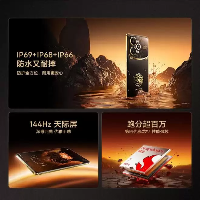 这款手机采用全球首创的热感变色设计,将温变粒子融入机身,黑色背板遇热即会转为红色。当深邃的暗黑蜕变为炽烈的坦格利安红,宛若真龙吐息,将经典剧作场景于掌心震撼重现!