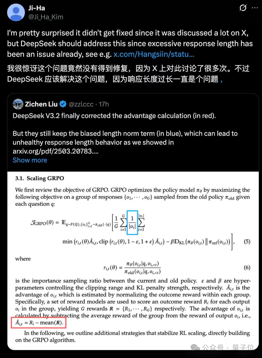 这项研究的核心作者Zichen Liu指出,DeepSeek-V3.2已经通过新的优势值计算方式,修正了"难度偏见"(如下图红框所示)。