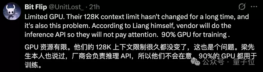 另外,也有网友指出,DeepSeek的128K上下文已经很久没更新了。这与GPU资源有限也不无关系。