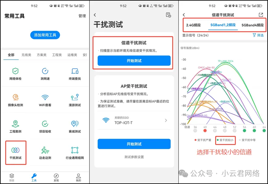 可使用专业的网络扫描工具(例如商云APP、WIFI魔盒或网络百宝箱等应用)对当前信道质量进行检测,并将AP切换至较为空闲或干扰较小的信道后再次进行测速。
