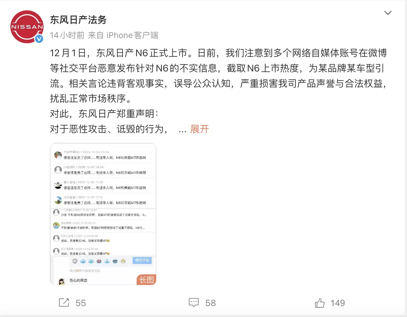 12月4日,东风日产法务部发表声明称,近期发现多个网络自媒体账号在微博等社交平台恶意散布针对日产N6的不实信息。这些账号通过截取N6上市话题热度的方式,为某品牌特定车型进行引流,相关不实言论已对正常市场秩序造成干扰。