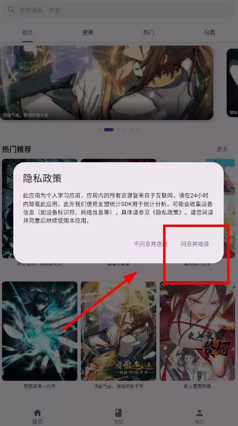 想要在挽离漫画App上畅读心仪的漫画吗?操作流程其实非常简单。首先在本页下载安装包,完成应用安装后,点击同意用户协议即可进入软件主界面。在这里,点击上方的分类标签不仅能精准检索您想看的漫画类型,还能自定义设置韩漫、国漫、日漫等不同分类。