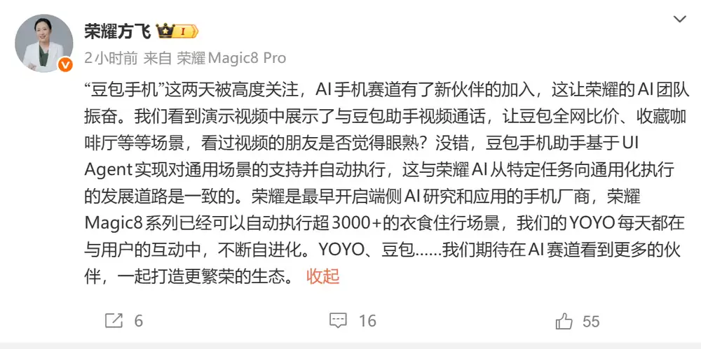 确实如此,豆包手机助手采用的UI Agent技术,使其具备了对通用场景的理解与执行能力。这种技术路线与荣耀AI的发展方向不谋而合——作为最早布局端侧AI研发的手机厂商,荣耀Magic8系列目前已能自动执行超过3000个衣食住行场景任务。我们的YOYO助手每天都在与用户的互动中持续进化,从YOYO到豆包......我们期待在AI赛道看到更多志同道合的伙伴,共同打造更加繁荣的智能生态。