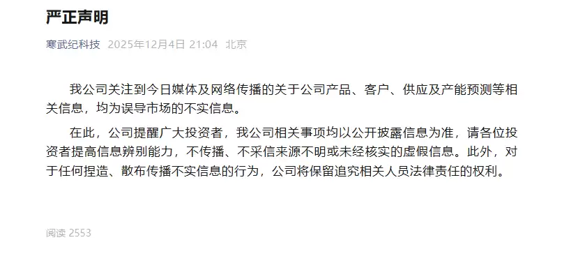12月4日,寒武纪-U(688256.SH)发布官方声明,对近期媒体与网络流传有关公司产品布局、客户关系、供应链动态及产能预测等信息做出正式回应,明确指出这些传闻均属不实信息,已对市场造成误导。
