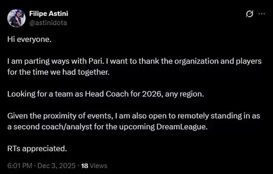 PVISION战队正式宣布与主教练Astini分道扬镳,新教练人选将于近日公布。