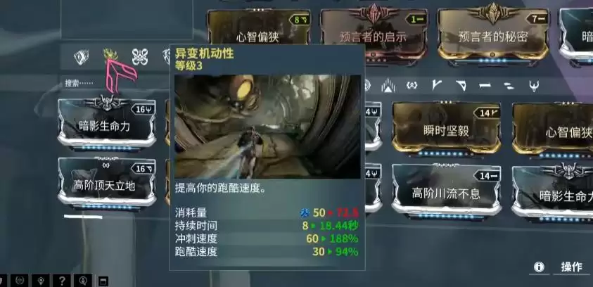 【极限速度型配卡】面向追求极致位移性能的玩家,强调单次冲刺距离、加速响应与视觉张力。推荐MOD包括:急速冲刺、冲击、瞬时坚毅、盲怒、能量奔流、高阶持久力、心智偏狭、预言者的启示、预言者的秘密、暗影聚精会神;赋能选用幻象与保卫者。此套方案对操作节奏要求更高,前期能量管理需更谨慎,但成型后在直线路径上的移动效率接近当前版本上限。