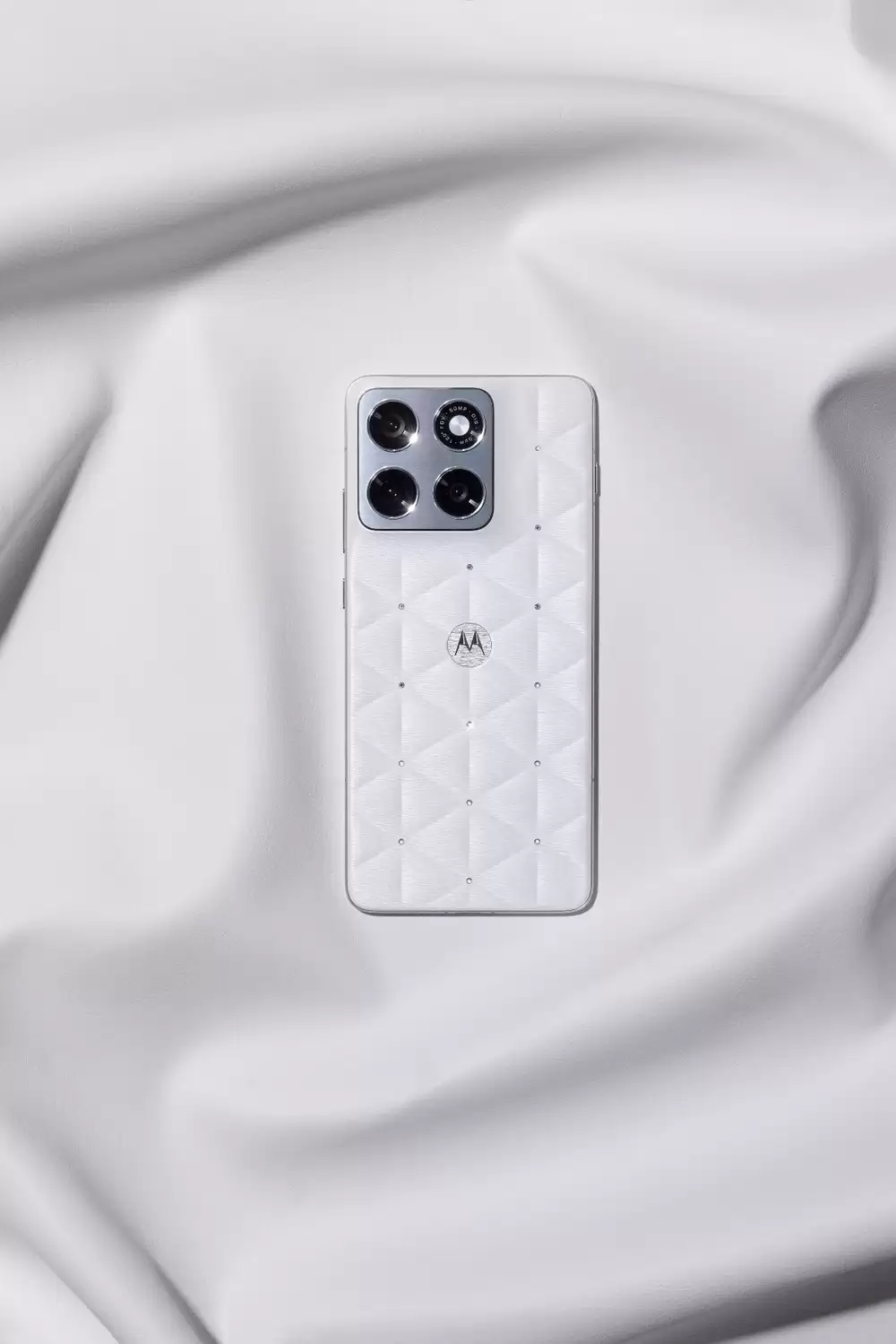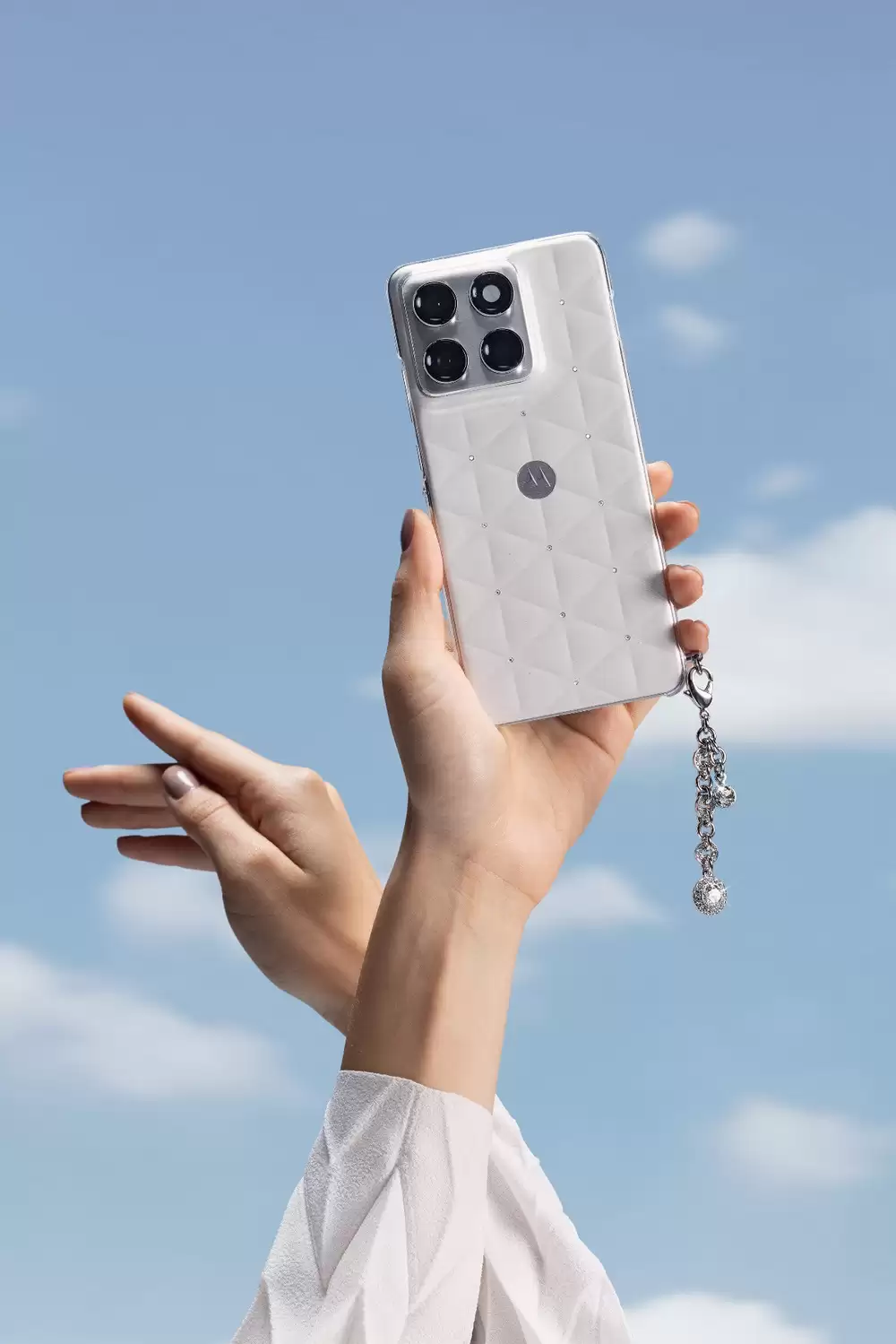 联想moto X70 Air云上舞白冰钻限定版以“云舞”为名,重新诠释“轻薄”之美——既是一种目之所及、属于天空的诗意;更是一种身之所感、摆脱重量的自由舞姿。机身采用立体三角形格纹工艺,设计灵感源自钻石切割技艺,每个线条交汇处,均由匠人手工镶嵌14颗施华洛世奇冰钻,每颗冰钻均含9个切面。交错的线条如钻石火彩般流动闪耀,素皮表面精心雕琢立体丝绢纹理,呈现出柔软的高级触感与视觉体验,完美演绎“云上高定”的美学理念。