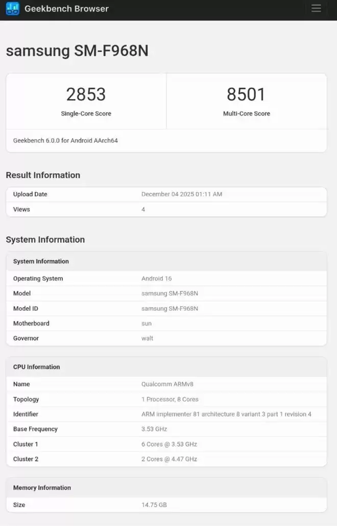 近日,科技媒体SammyGuru曝光了三星Galaxy Z TriFold在GeekBench 6.0.0版本中的跑分数据,其单核成绩达到2853分,多核成绩为8501分。