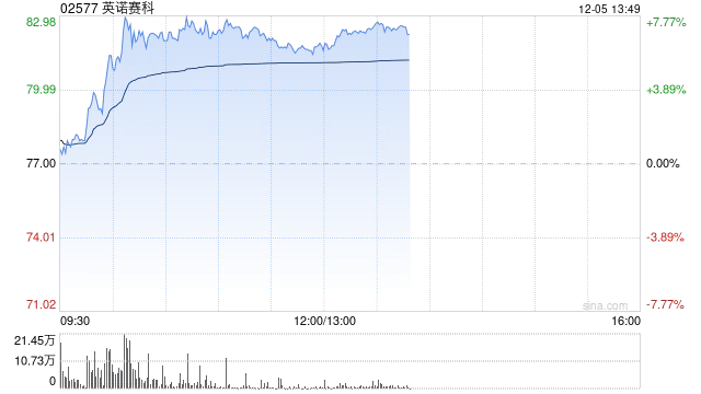 英诺赛科(02577)股价今日盘中一度飙升逾7%,本月累计涨幅已突破两成。截至发稿前,该公司股价上涨6.88%,报82.30港元,成交额达4.76亿港元。