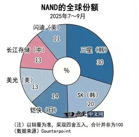 市场调研机构Counterpoint的数据显示,长江存储在2025年1-3月首次实现全球NAND出货量份额达到10%。到了7-9月,其份额进一步攀升至13%,直追全球排名第四的美国美光科技。在中国品牌的笔记本电脑和智能手机领域,长江存储产品的采用率持续攀升,全年市场份额有望突破一成。
