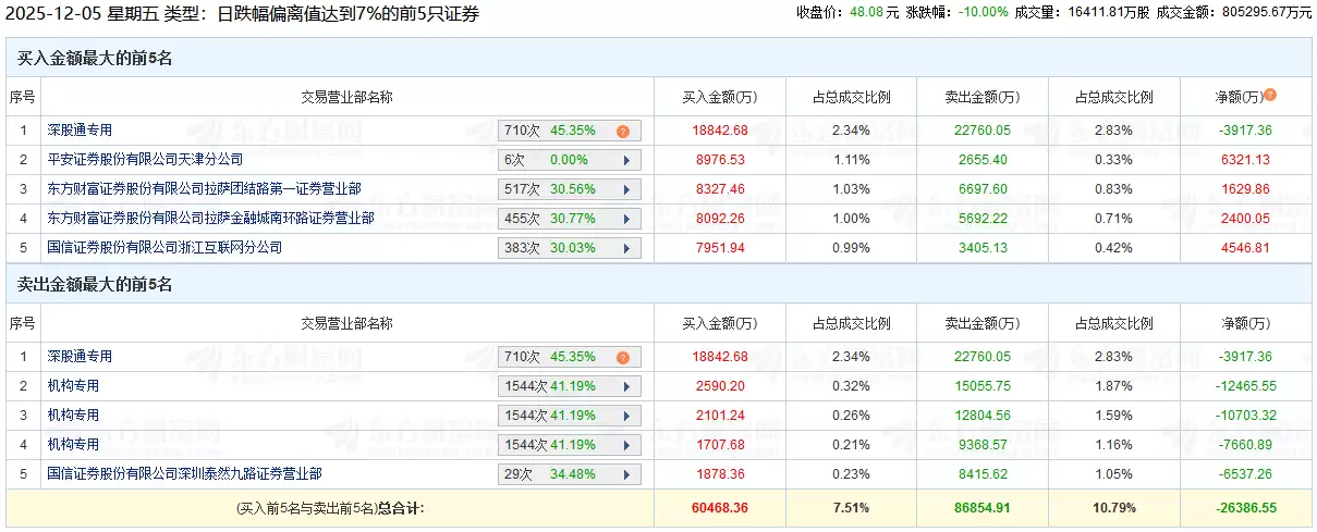 12月5日,和而泰(002402.SZ)股价跌停,收盘报48.08元,跌幅达10.00%。