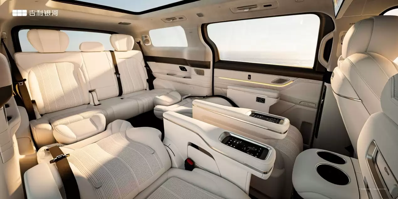 内饰空间布局方面,银河V900提供6/7/8座三种选择,第二排与第三排空间均超过1013mm,后行李厢容积可达1100L。座椅采用Nappa全粒面真皮包裹,支持加热、通风、SPA级按摩及电动调节功能,后排还配备了17.3英寸娱乐屏。科技配置上,新车搭载Flyme Auto 2.0车机系统,内置骁龙8295P旗舰芯片,并集成了DeepSeek与吉利自研的星睿AI大模型,全车配备4个50W风冷无线快充面板。