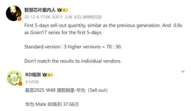 而根据博主透露的信息,华为Mate80标准版成为销售主力军,用户提供的数据显示标准版与高端版形成70:30的销售比例。