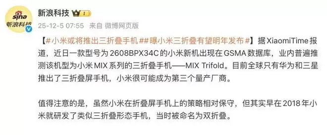 按照爆料中的说法,小米有望在2026年带来旗下的三折叠屏手机。