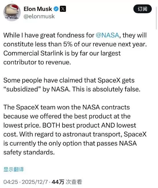 他在回复中写道:“我个人非常尊敬NASA,但他们在我们总收入中的占比明年不会超过5%。已经实现商业化的星链,仍然是我们收入贡献最大的一块。外界有些说法认为SpaceX是靠NASA‘补贴’起家的,这种观点是完全错误的。SpaceX能拿下NASA的合同,是因为我们既能提供性能最好的产品,又能做到最低的成本——两者同时做到。在宇航员运输业务上,SpaceX目前是唯一通过NASA安全认证的方案。”