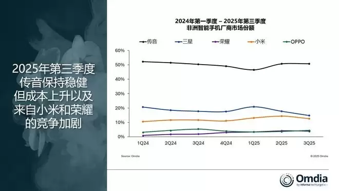 市场研究机构Omdia发布的最新报告显示,2025年第三季度,非洲智能手机出货量同比增长了24%,实现了自2024年以来的首次双位数增长。其中,荣耀已连续三个季度保持三位数的同比增长,其200 Lite等高性价比机型有力推动了南非市场份额的提升。目前,荣耀以4%的市场份额与OPPO基本持平,但其增长率高达158%,展现出强劲的发展势头。