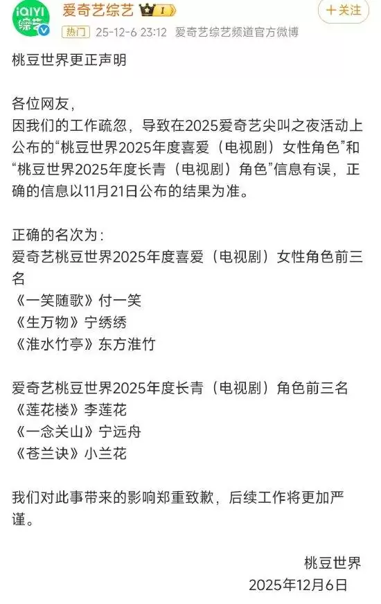 12月7日上午,新浪科技发布消息称,爱奇艺就“尖叫之夜”活动中的信息错误问题发布致歉声明。该公司表示,由于内部工作疏忽,导致在“2025爱奇艺尖叫之夜”活动现场公布的“桃豆世界2025年度喜爱女性角色(电视剧)”和“桃豆世界2025年度长青角色(电视剧)”两项榜单信息有误。正确的获奖结果应以官方在11月21日正式公布的名单为准。