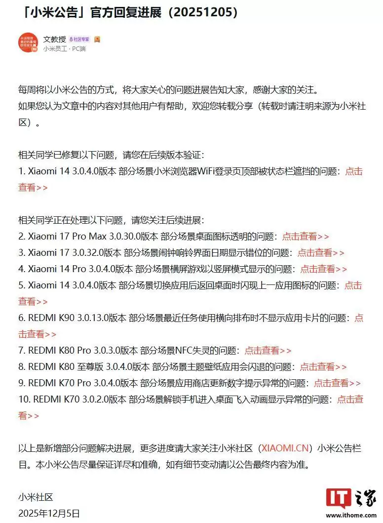 12月7日,IT之家从小米社区获悉,小米员工本周更新了澎湃HyperOS的最新优化进展。其中提到,用户反映的小米14在3.0.4.0版本中,部分场景下小米浏览器WiFi登录页面顶部被状态栏遮挡的问题已得到优化,将在后续版本中验证。此外,小米最新的优化还定位到了小米17系列部分机型的相关问题。