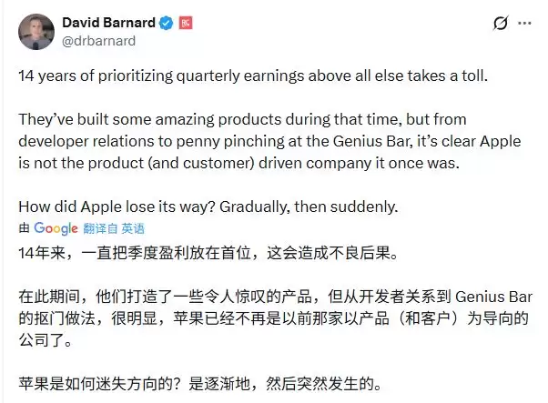 许多网友批评库克领导下的苹果已失去创新远见,过度追求季度利润导致公司文化从“以产品为中心”转向“成本优先”,尤其在人工智能等关键领域反应迟缓,使其逐渐从行业引领者沦为跟跑者。