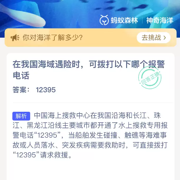 在我国海域遭遇险情时,可以拨打以下哪个报警电话?【神奇海洋】12月7日新题目已开答!正确答案现已公布,点击领取拼图,一同为修复海洋生态贡献力量!今日正确答案是:【12395】。中国海上搜救中心在我国沿海和长江、珠江、黑龙江沿线主要城市都开通了水上搜救专用报警电话“12395”。