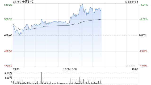 宁德时代(03750)股价早盘冲高,涨幅一度超过4%。截至发稿时,该股涨幅仍维持在3.38%,报507港元,期间成交额达10.79亿港元。