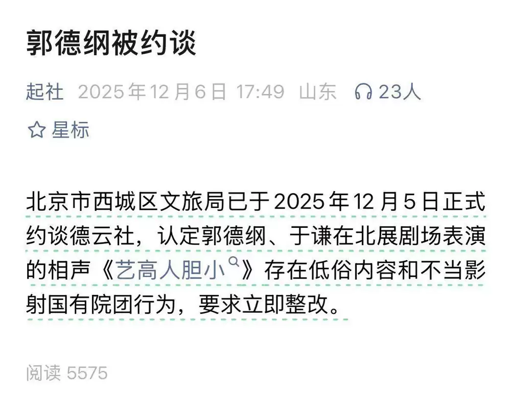 12月8日,据极目新闻报道,一则关于相声演员郭德纲“被约谈”的消息于7日晚间在网络不胫而走。一篇由个人微信公众号“起社”发布的文章《郭德纲被约谈》中提到:“北京市西城区文旅局已于2025年12月5日正式约谈德云社,认定郭德纲、于谦在北展剧场表演的相声《艺高人胆小》存在低俗内容和不当影射国有院团行为,要求立行立改。”