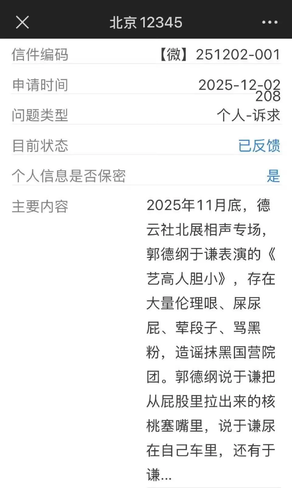 此外,网络上还有两张截图流传甚广。一张为网友12月2日提交给北京12345的投诉截图,图中投诉内容为:“2025年11月底,德云社北展相声专场,郭德纲于谦表演的《艺高人胆小》,存在大量伦理哏、屎尿屁、荤段子、骂黑粉,造谣抹黑国营院团(等台词)。”
