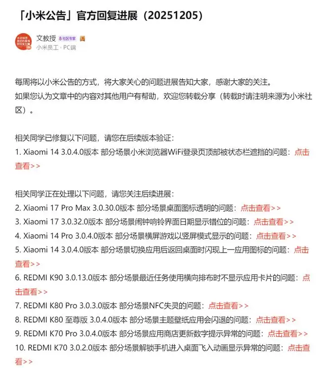 近日小米社区发布《澎湃OS最新回复进展(20251205)》,以每周公告的形式同步系统问题处理进展。