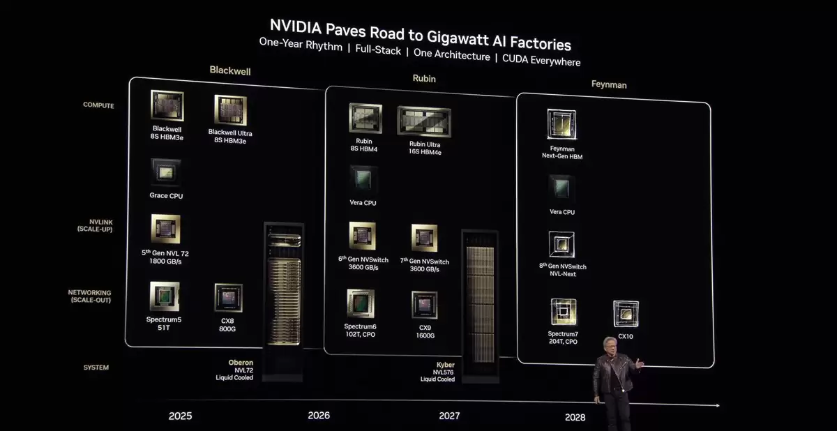 行业普遍预计,英伟达下一代架构Vera Rubin将在GTC 2026上成为焦点。该架构预计将集成HBM4内存、采用台积电3纳米制程,并进行网络技术升级,性能较当前Blackwell架构有显著提升。此外,英伟达可能也会透露更长期的Feynman架构路线,展现其在AI算力领域的持续布局。