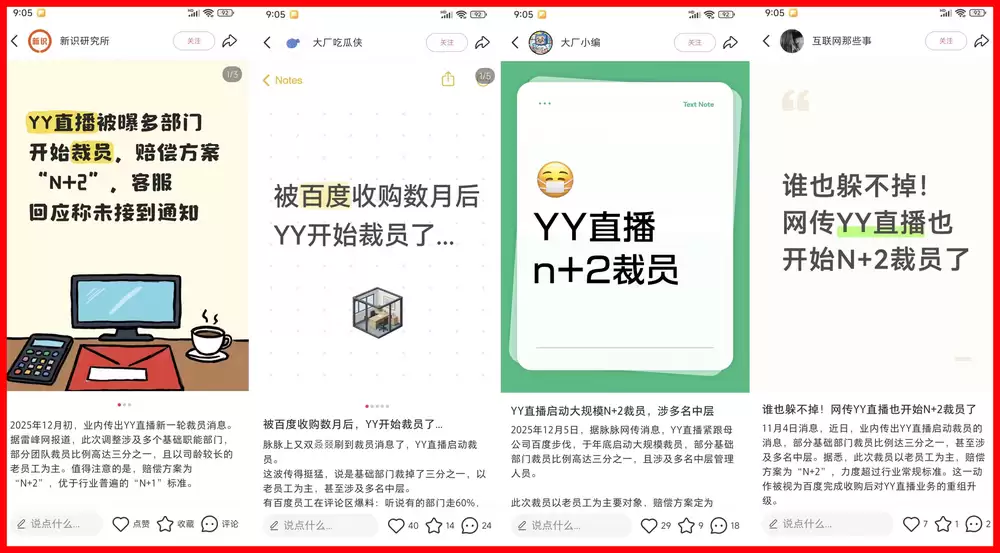 这一举措距离百度以21亿美元正式收购YY直播并将其全面纳入其职级体系,仅仅过去了三个月。关于YY直播裁员的传闻始于2025年12月初,已有多个信源证实了这一消息的真实性。据报道,此轮调整波及多个基础职能部门,部分团队的裁员比例甚至高达三分之一。