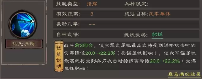 效果:前三回合为我军武力或谋略属性最高的武将分别减免谋略或兵刃伤害,适合用于搭配高输出核心(如吕布、关羽)的阵容,能显著提升核心武将的生存能力。