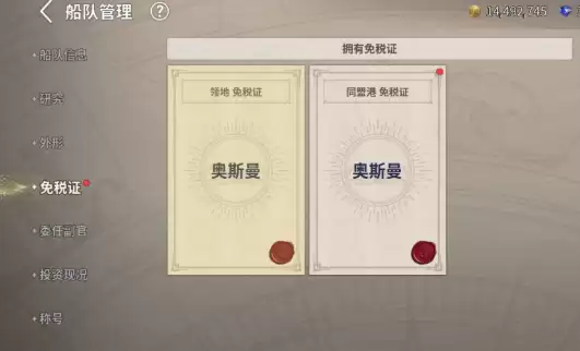 免税证在实际使用范围内分为两个类别,各自适用于不同的贸易场景。一类是领地的免税证,只要持有此类证件,在目标国家的主城及其管辖的所有领地的港口进行交易,都能享受到关税减免。这适合那些经常在某个国家境内多个港口之间往返贸易的玩家。另一个类别是同盟港免税证,它的生效范围仅限于目标国家的同盟港区域,更适合那些以跨国同盟港为核心贸易路线的玩家。不过需要注意的是,这两类免税证都有明确的有效期限,过期之后减免效果就会失效,所以玩家可以在到期之前及时重新获取。