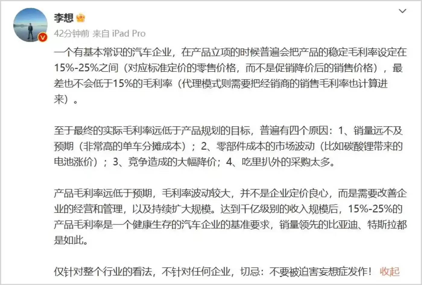 同时,也吻合李想曾在微博上所说的,“一个有基本常识的汽车企业,在产品立项的时候普遍会把产品的稳定毛利率设定在15%-25%之间,最差也不会低于15%。”